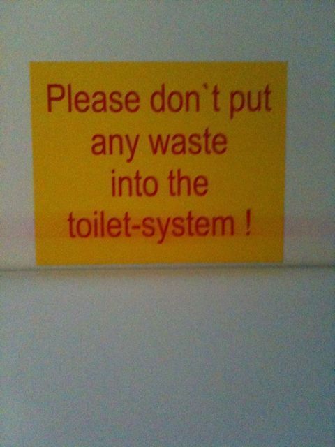 This sign appears over the toilet in my ships cabin. The dilemma it creates is obvious. If you can’t put it here, where do you put it? More important, how do you put it elsewhere? And, what do you put in the toilet?