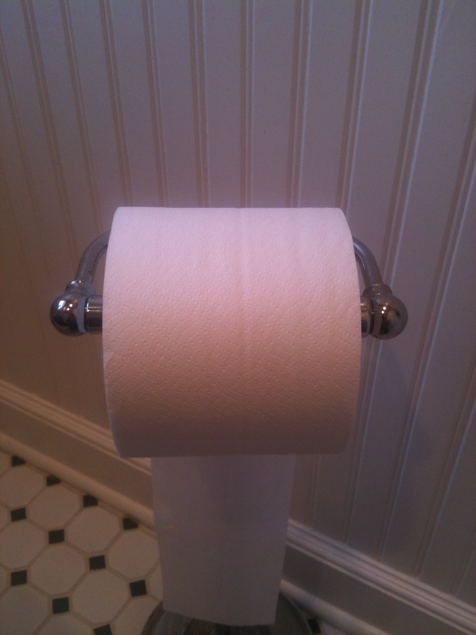 That begs another question, should the end of the roll go over the top or under the bottom? I believe over the top is most traditional, but the problem is finding the end of the roll when it lands on the top of the roll. On the other hand, under the bottom provides a good chance that the end of the roll will hang free in the breeze thus remaining easily accessible. Give it a try.