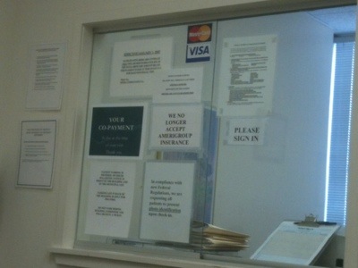 I took this picture a few days ago in a doctor’s office. Not much to see I admit, but take a closer look and you will see notices required by federal regulation, about paying for care, about health plans no longer accepted, about co-payments, etc.