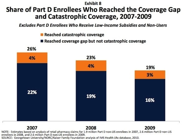 The reason for the low impact of the so-called coverage gap is that lower-income people with both Medicaid and Medicare are not affected by higher out-of-pocket costs (plus in several states there are low-income prescription benefits in addition to Medicare), there is still the group that has coverage through their former employer that covers the gap and many on Medicare do not take enough drugs to reach the donut in the first place.
