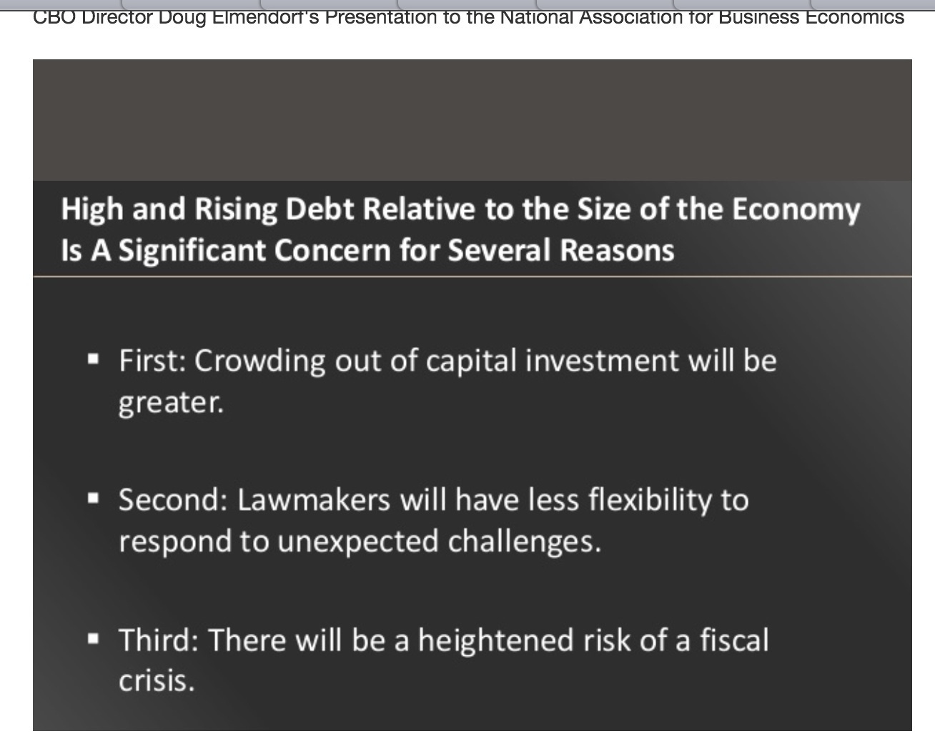 I also direct your attention to the third slide which talks about the debt being even larger if Congress did certain things. The problem is that Congress is very likely to do those things most detrimental to the debt, things like not allowing current cuts to continue and not allowing Medicare physician payment cuts to go into effect (which they have never allowed since the law was enacted). Then what?