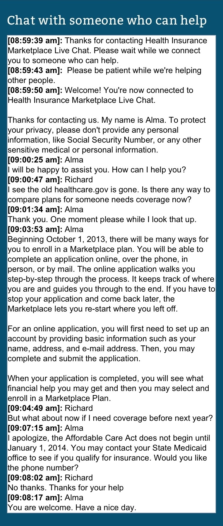 Recently I visited healthcare.gov to see what plans are available now in my state. This site has been up for years. What I found is that the site has been changed in preparation for Obamacare as of October 1, 2013. One new feature is a live chat. You can ask questions and “talk” to a representative. I did so on a Sunday morning. Following is my chat.