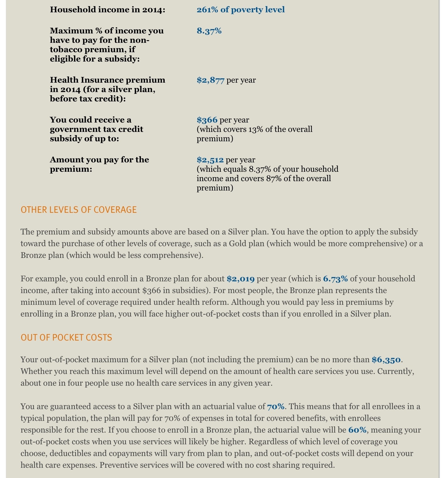I went to the marketplace premium estimator to get a sense for prices and tax credits based on the national average. I entered a person age 30, non-smoker earning $30,000 a year. Even in the lowest level bronze plan after the tax credit, the monthly contribution was more than $100 and that plan left them with considerable out of pocket costs. In a silver plan the individual would pay on average 30% of incurred costs and in the bronze plan 40% in addition to the premium.