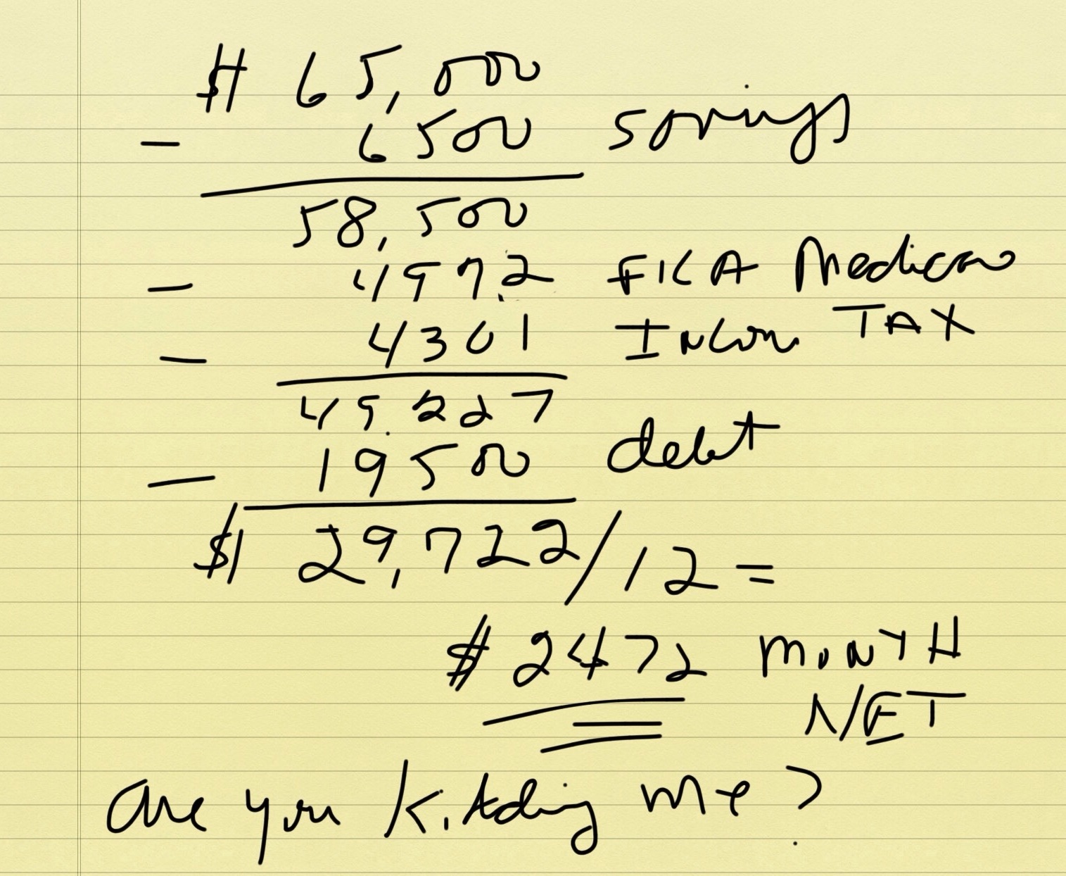 Let’s test this theory on a family earning $65,000 with one child; pretty average I believe. The family has total savings of 10% on a pre-tax basis which is the minimum desirable since we assume no additional savings of any kind. The debt service at 30% is $19,500 per year. The income tax is based on an IRS calculator assuming standard deductions.