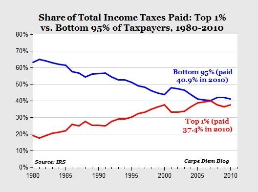3. As the top 1% have steadily driven down the incomes of the bottom 95%, the bottom 95% have earned less and have, therefore, paid less income taxes. Duh!