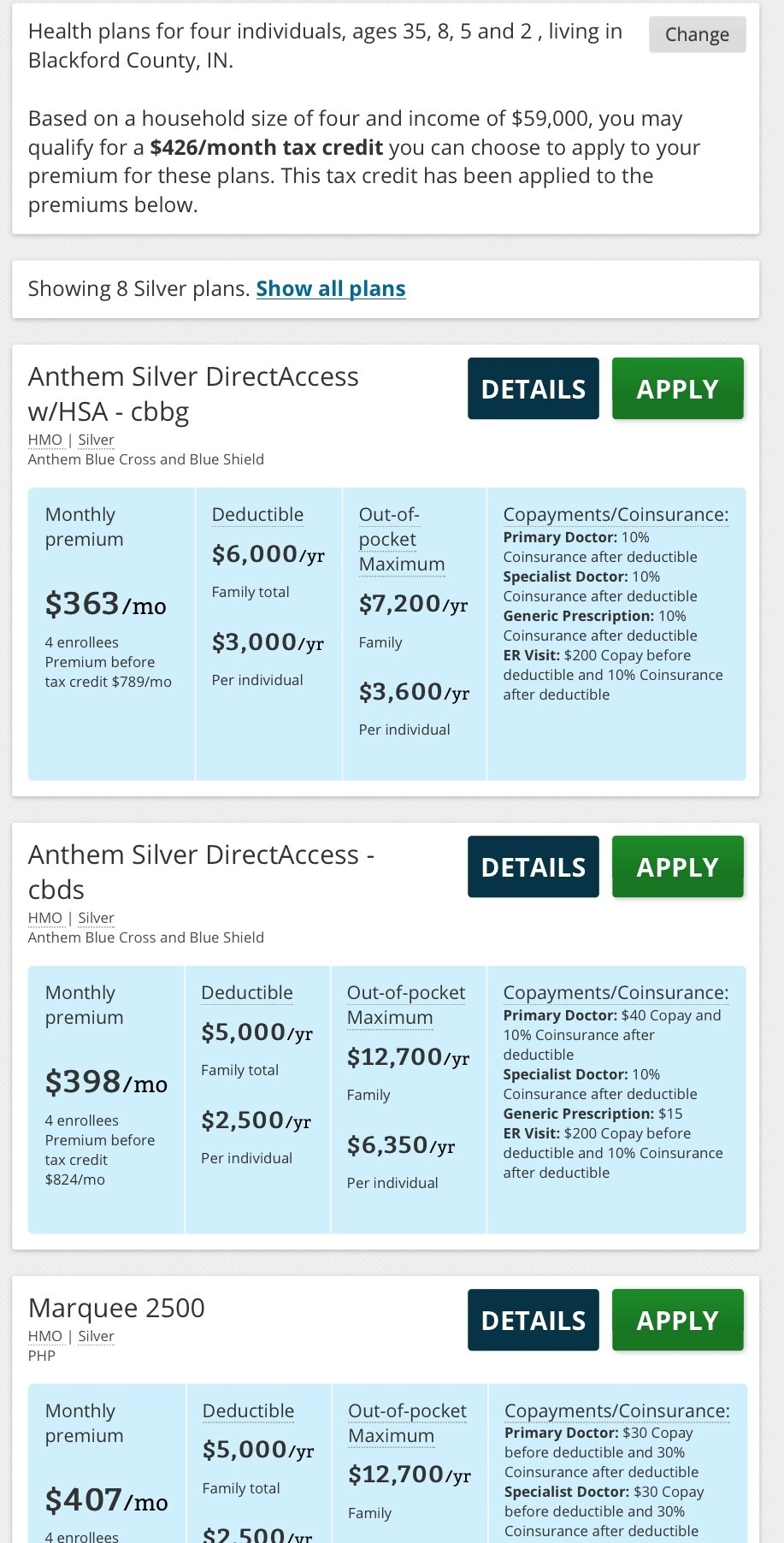 For a women who lives in Indiana her children are eligible for Medicaid or CHIPS up until an income of $59,000. But let’s say she does earn $59,000. Following are her health care options in her county in Indiana. She is eligible for a $426 tax credit, but even that is no bargain if you look at her premium and out-of-pocket costs. On the other hand, if she drops her hours and hence her income, she could see her children covered not by private coverage, but by Medicaid.