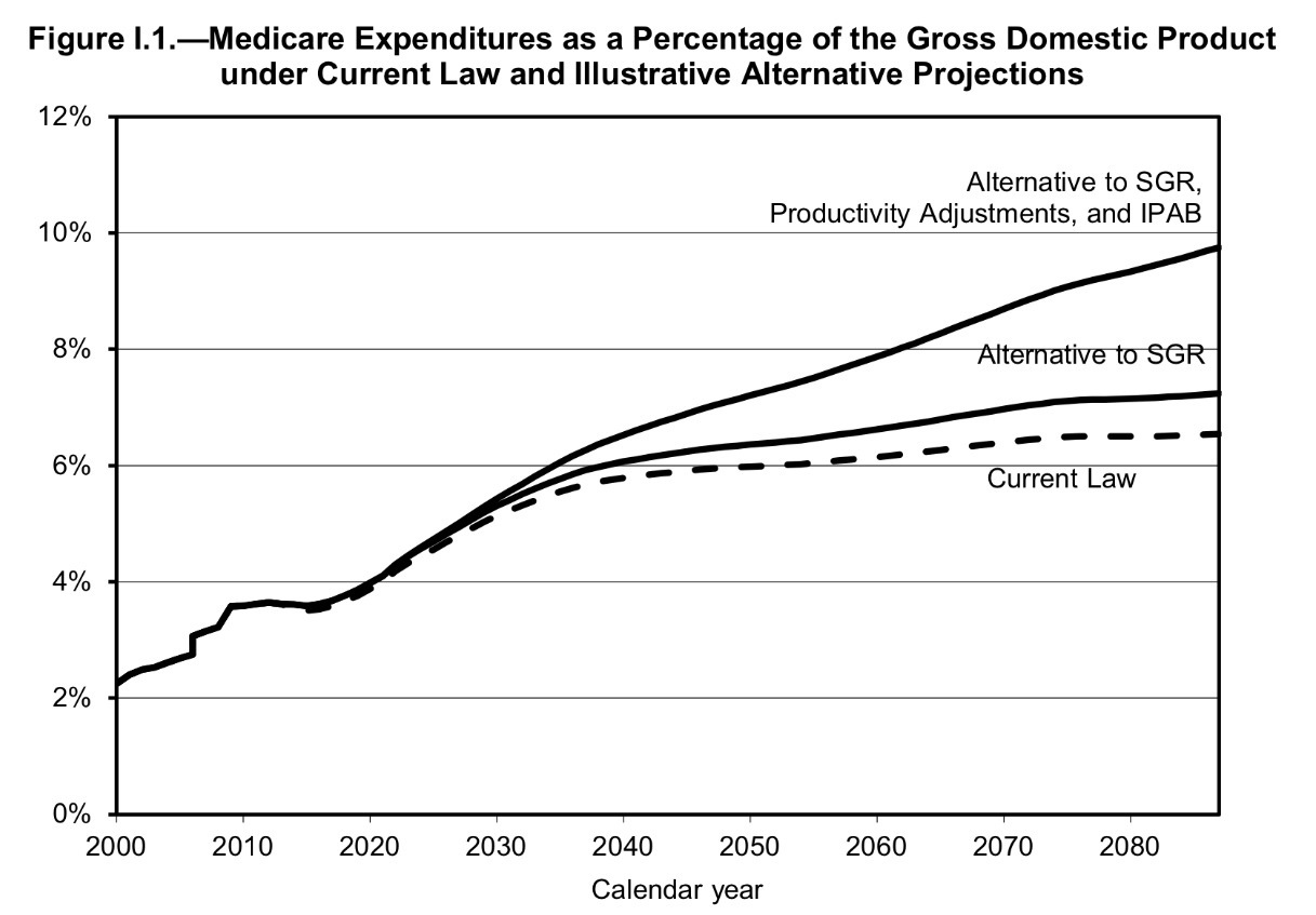 Total Medicare expenditures were $574 billion in 2012. The Board projects that, under current law, expenditures will increase in future years at a somewhat faster pace than either aggregate workers’ earnings or the economy overall and that, as a percentage of GDP, they will increase from 3.6 percent in 2012 to 6.5 percent by 2087 (based on the Trustees’ intermediate set of assumptions).