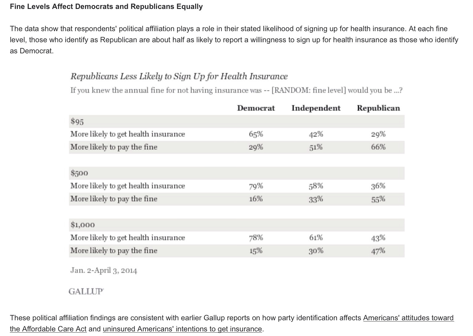 Now the interesting part about Republicans … they are far less likely to be motivated to have health insurance than Democrats, at least that’s what they told Gallup.