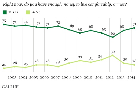 Another measure of Americans’ personal finances has shown a positive uptick over the last two years. Seventy-one percent of Americans now say they have enough money to live comfortably, while 28% say they do not. Over the last 12 years, the majority of Americans have consistently said that they have enough money to live comfortably, but that percentage fell to as low as 60% in 2012.
