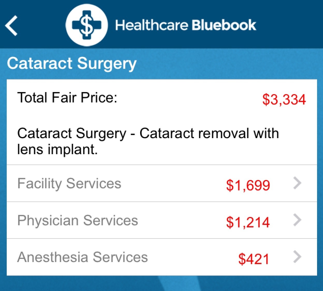 The amounts shown left to right are Billed, Allowed and Paid by Medicare. The fees are the ophthalmologist, anesthetist and outpatient surgical center top to bottom.