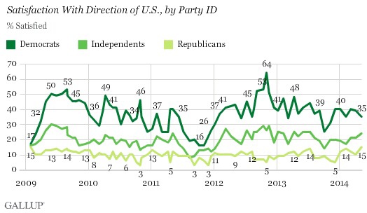 Democrats (35%) and independents (24%) continue to be more satisfied with the state of the nation than Republicans (15%). Although low, the current level of satisfaction among Republicans is, by one percentage point, at its highest level since January 2009 when President Barack Obama was inaugurated.