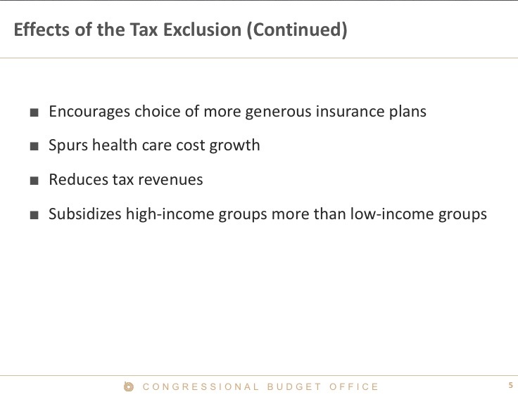 As to the last bullet, what that is saying is that the greater percentage a person pays in income tax, the greater the benefit of tax-free benefits or deductions. That’s simple math, but so is saying the more a person earns, the more they pay in taxes and the larger percentage they pay. In addition, since the value of the benefit is not income related, the lower income workers receive greater value and a greater portion of their total income from the health benefit exclusion.