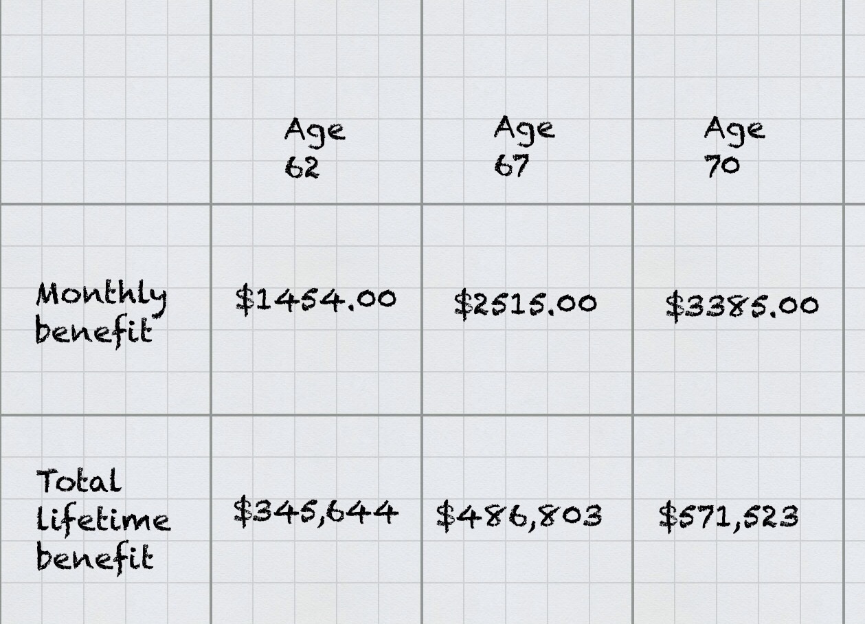 [Note the total payment amount assumes you live to your full life expectancy. These amounts do not include a spousal benefit which could add 50% more to the monthly benefit while the primary beneficiary is alive. Also, all amounts are in inflation adjusted future dollars.]