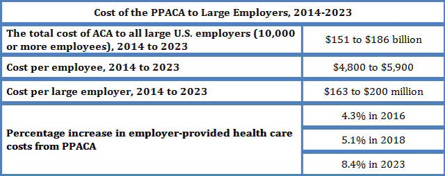 According to the report, the PPACA is estimated to increase the healthcare costs for large employers by 4.3% in 2016, 5.1% in 2018, and by 8.4% in 2023, with the increase primarily due to the high-cost excise tax that begins in 2018. For just the 31 large employers (those with 10,000 or more employees) that responded to their survey and provided cost estimates through 2023, the total cost of the PPACA over the next 10 years could be as much as $10.5 billion unless changes are made to their healthcare plans. This averages out to about $338.1 million per company that responded to the survey over 10 years.via The Cost of the Patient Protection and Affordable Care Act (PPACA) to Large Employers.