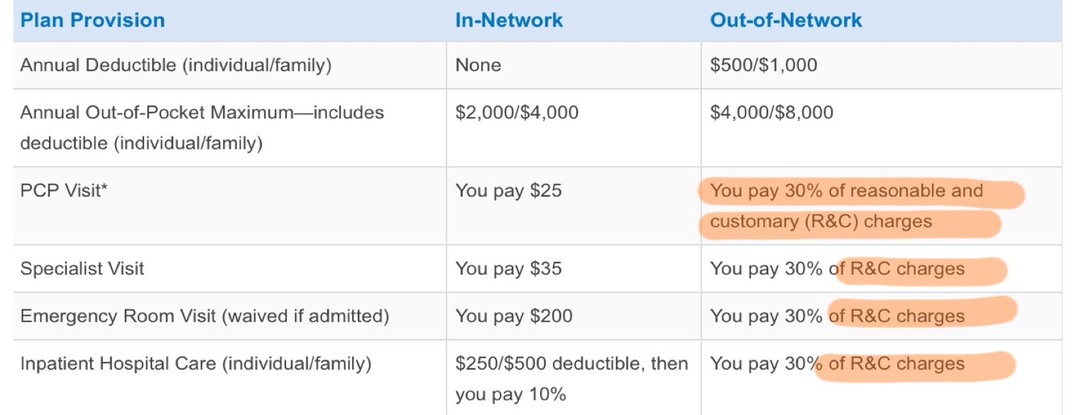 Let’s say out of 100 doctors 80 of them charge $1,000 or less for a procedure and 20 will charge more. The R&C fee limit is set at $1,000. Now say you use a doctor not in your network and his charge is $1,500 for this procedure.
