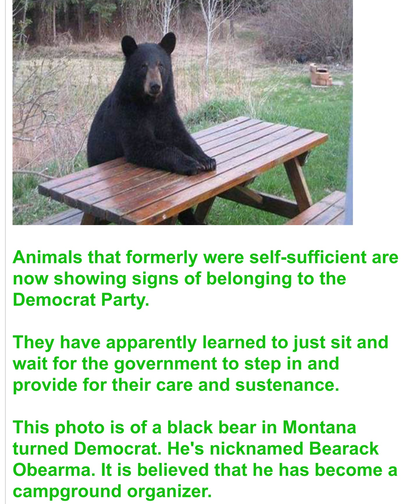 2. No, Mr. Quinn, that is a Republican supported oligarchic bear who is proclaiming, “I bought this table, I bought this campground, I bought this national park and next I will buy Congress. If you are not big, tough, strong and rich like I am, you are lazy!”