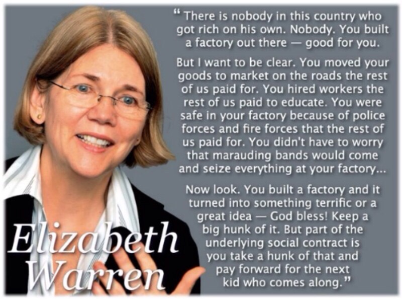 She says: “…There is nobody in this country who got rich on his own. Nobody. You built a factory out there – good for you. But I want to be clear. You moved your goods to market on the roads the rest of us paid for. You hired workers the rest of us paid to educate. You were safe in your factory because of police forces and fire forces that the rest of us paid for. …”