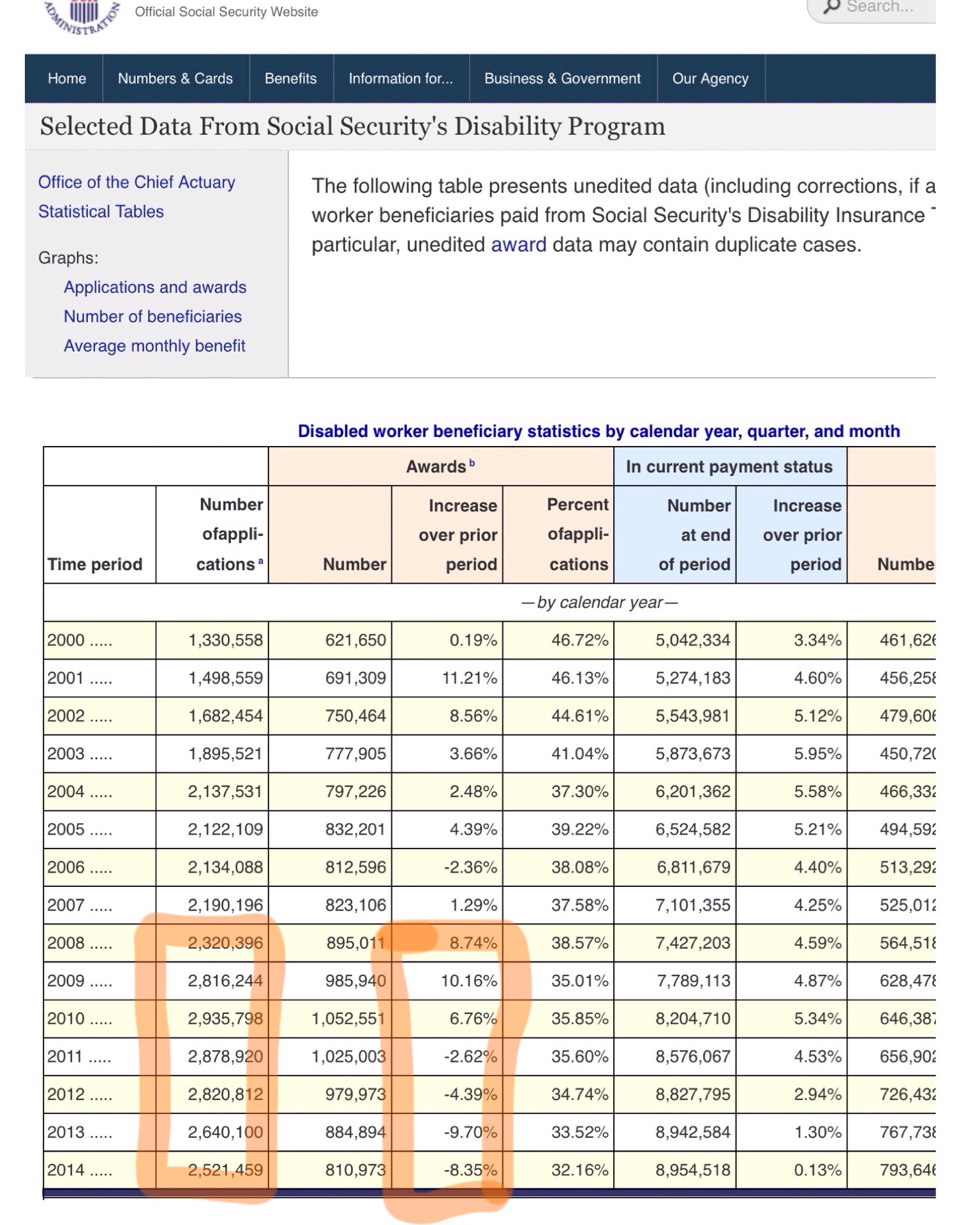 Liz doesn’t think there is a problem with Social Security disability and we should just throw more money at it. Look at the data below. Look at the increases since 2007. Do you think any of this has more to do with the employment situation than an increase in disabled people? Do you think this reflects people just dropping out of the workforce because they can get early Social Security? Do you think all these people are truly disabled to the point they cannot be employed? If our programs designed to help those in need were managed to do just that, a lot of problems would be solved.