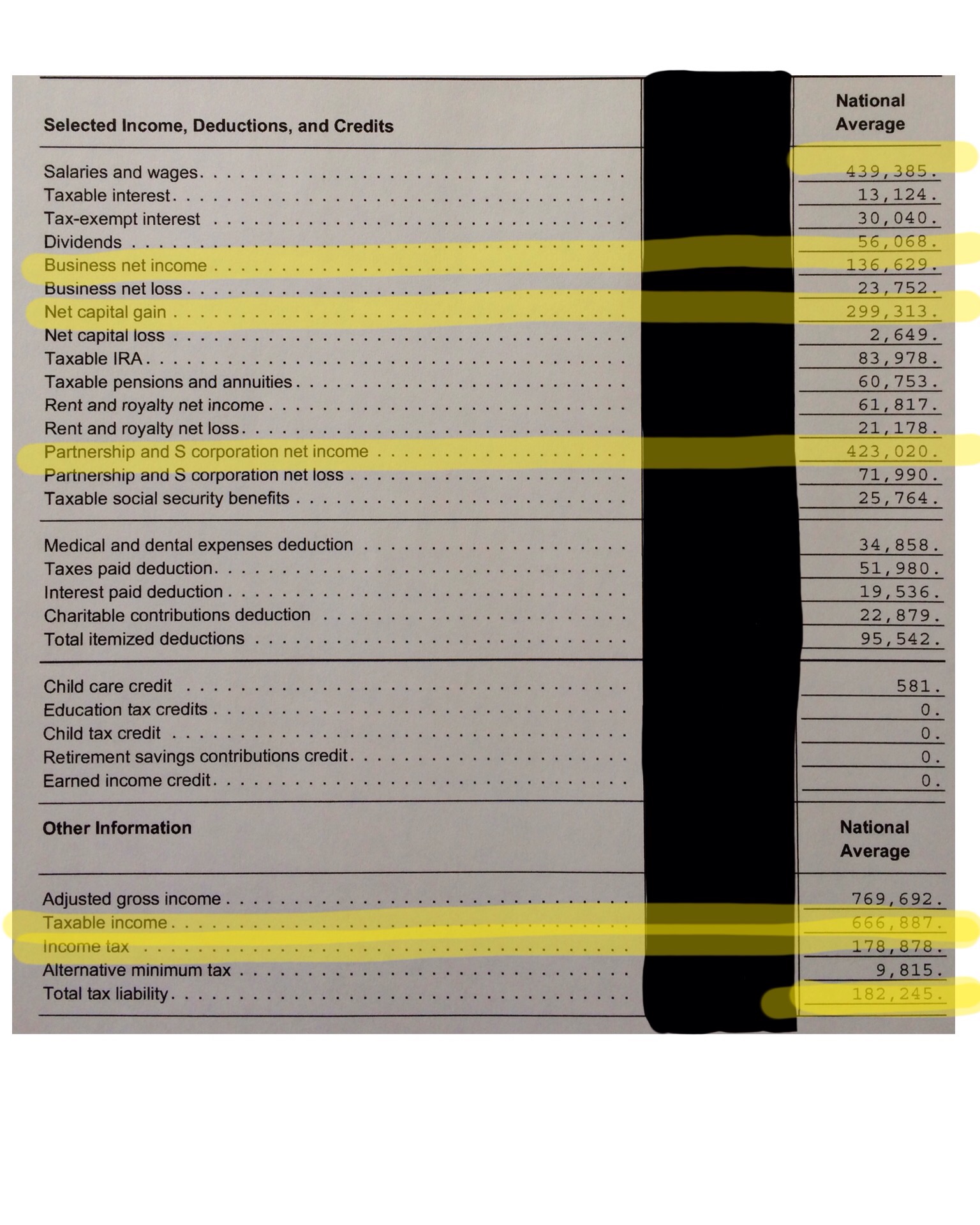 Take a look at the national averages for Americans with household incomes of $250,000 or more. These families makeup between 2% and 3% of all households. While $250,000 is a lot of money most Americans would love to earn, it is not “wealthy” in many parts of the Country, but rather upper middle class. On average this group pays 23.6% of its adjusted gross income in federal tax or 27.3% of taxable income, both considerably higher than the well touted 15%.