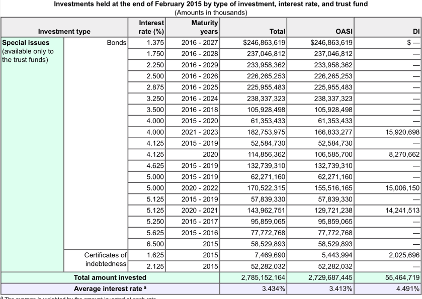 Money in the Social Security trust fund is invested in two types of fixed-income securities. The first are short-term “certificates of indebtedness” that range in duration from one to 364 days. The second are long-term “special-issue bonds,” with a maturity of one to 15 years. At the end of 2014, for example, the trust fund held $57 billion worth of certificates of indebtedness and $2.67 trillion worth of special-issue bonds.