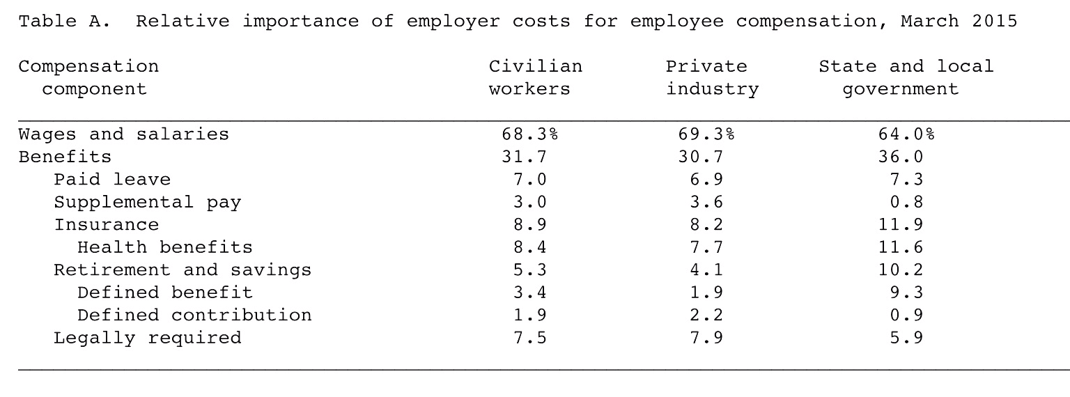 - Total employer compensation costs for private industry workers averaged $31.65 per hour worked in March 2015.