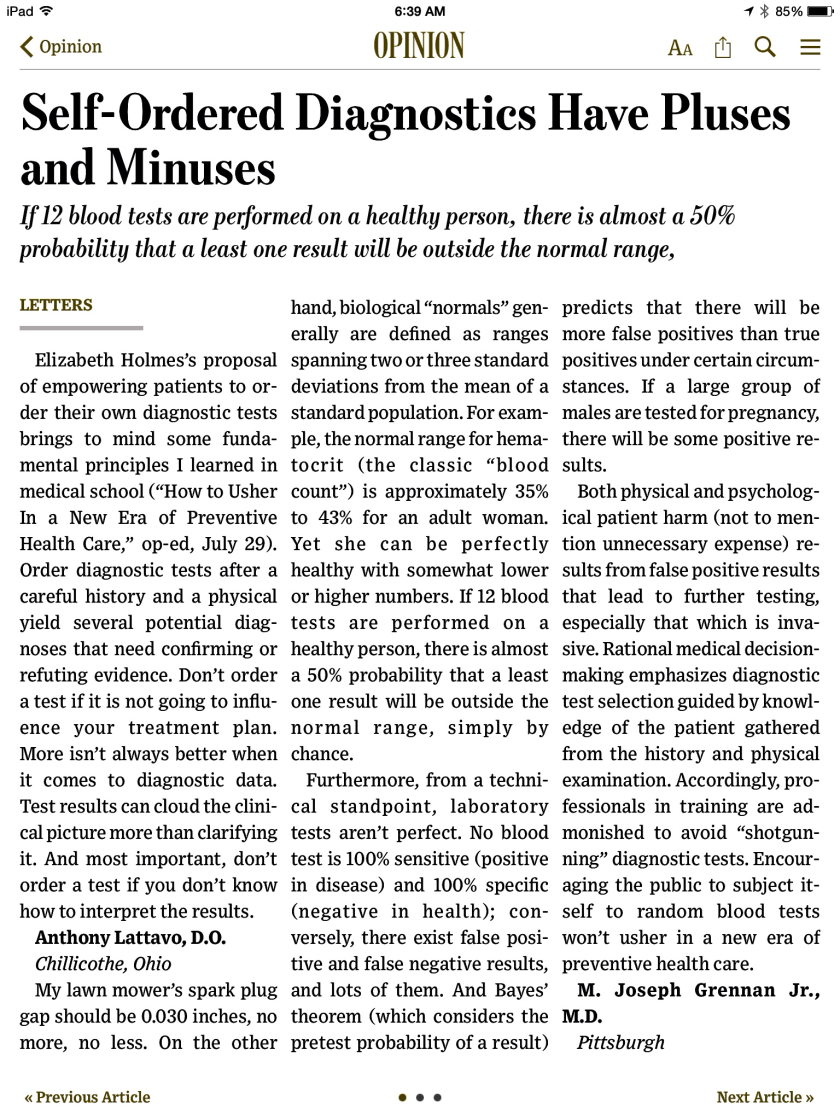 I could mention the absurdity of this or the risks to patients or the very likely increase in costs caused by patients reading an outlier on a test result running to their doctor and demanding more tests and more services – and the doctors fearing malpractice accommodating the patient against their better judgement, but instead I have included the rebuttal letters from physicians.
