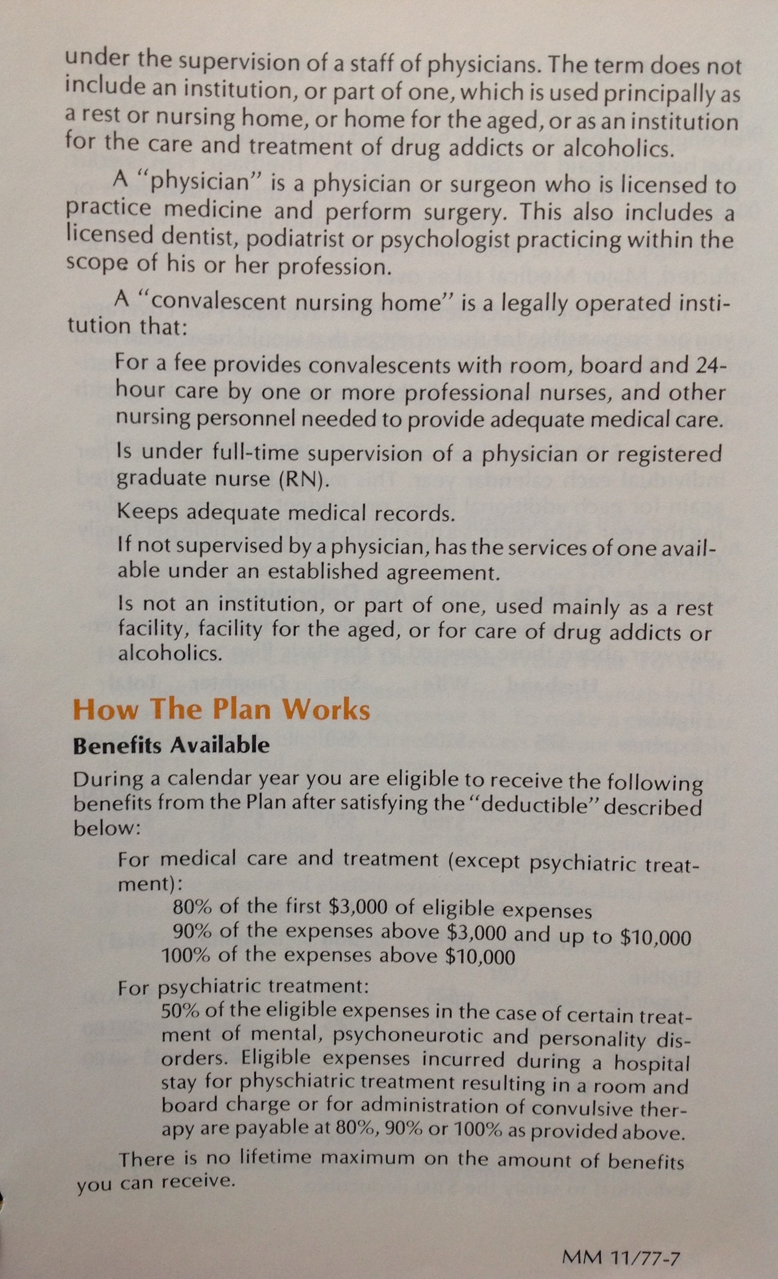 Here are pages from a benefit plan I wrote over thirty-years ago. There were real reasons for this type of coverage; mental health care is difficult to manage and can be subject to abuse, especially outpatient care. Nevertheless, we are beyond all that and now mental health care is reimbursed the same as other illness. It’s a difficult issue because we certainly want mentally ill people to receive all the care they need.
