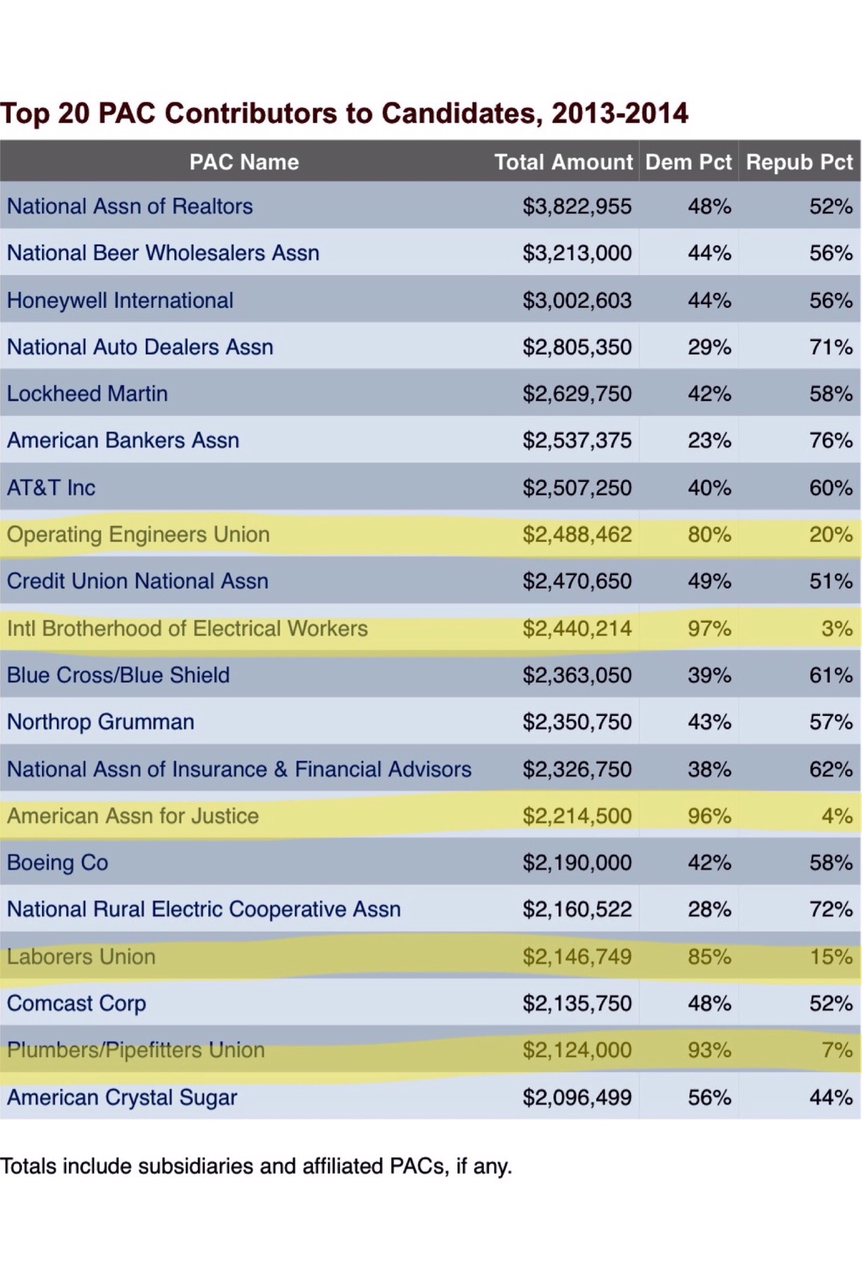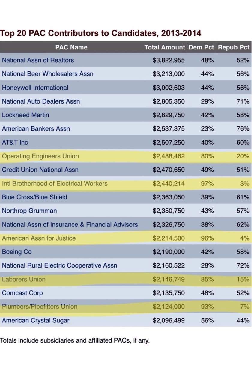 Here is a list of the top twenty PAC contributors from OpenSecrets.com