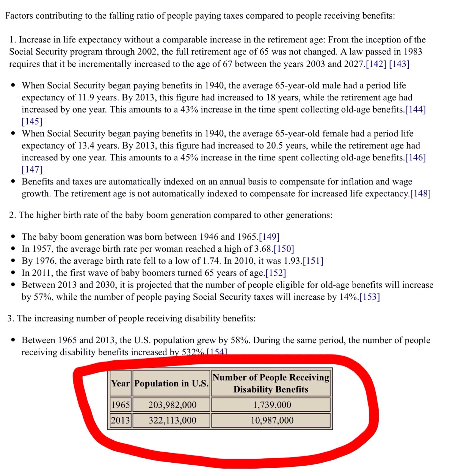 1. We follow facts that sound important, but really aren’t. They are vast rabbit holes. Social Security’s problems are simple, created by generations and generations of people collecting far more than they contributed. That is what the guy who ran Social Security in 1944 said was the problem and he clearly laid out the consequences. The problem is that you can’t sell dollars for dimes. Everything that you point to exacerbates the actual underlying problem. The facts that you provide are not the problem themselves.
