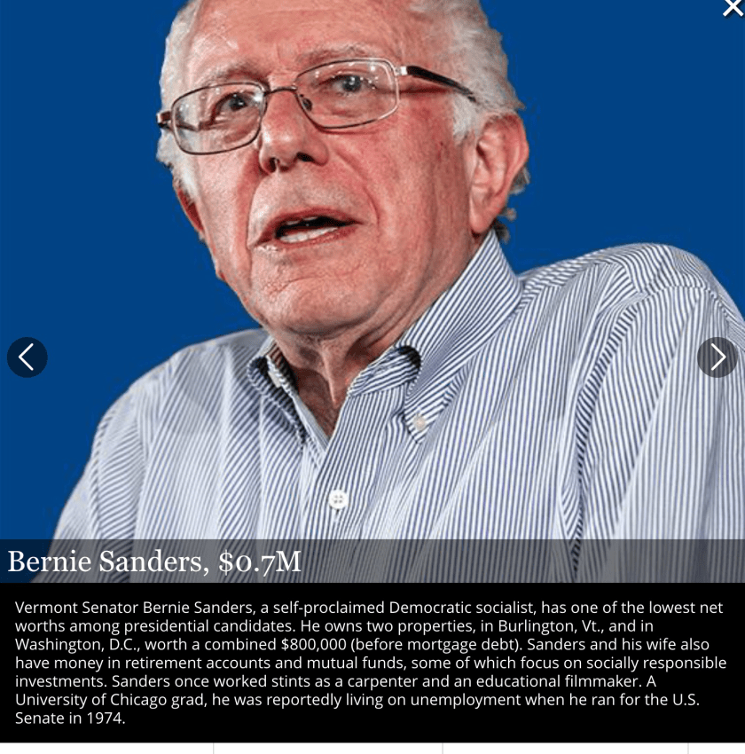 Net worth you say, one is age 74 and has virtually no savings beyond some home equity and the other looks like a spendthrift. Those numbers are their estimated net worth calculated by Forbes (others report Sanders net worth at closer to $400,000.)
