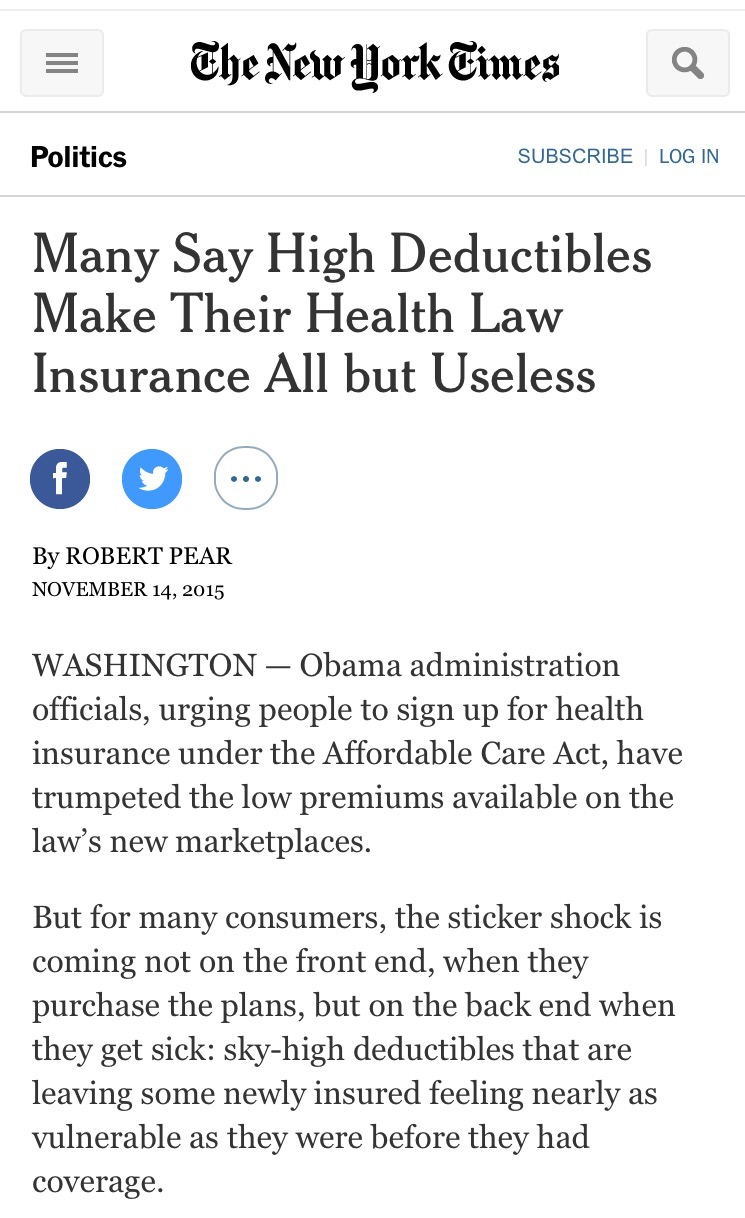 Health officials and insurance counselors cite several mitigating factors. All plans must cover preventive services like mammograms and colonoscopies without a deductible or co-payment. Some plans may help pay for some items, like generic drugs or visits to a primary care doctor, before patients have met the deductible. Under the Affordable Care Act, health plans must have an overall limit on out-of-pocket costs, to protect people with serious illness against financial ruin.  NYT 11-14-15
