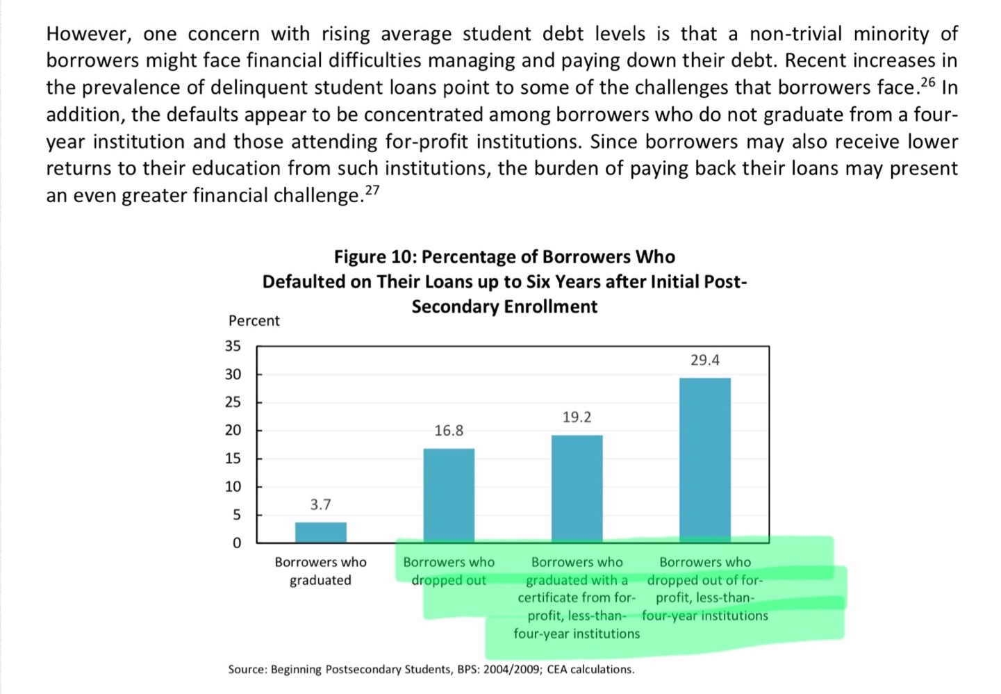 We hear a lot these days about student loans and their burden even leading to the call for free college. What we don’t hear about is the cause of the burden; mainly the choice or lack thereof of  income generating college majors and the fact that defaulting on student loans is almost exclusively the result of dropping out of college or lack of a four-year degree from a for-profit institution.