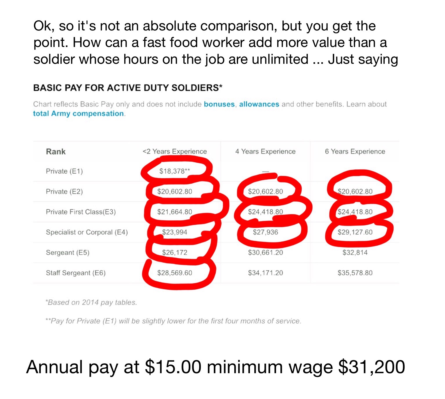 1. You are forgetting that the low rank private gets free housing, food, uniform allowances and free healthcare, plus other special pay for hazardous duty and war zone, tax exempt status. so add about $10,000 or more to their pay. Once again you skew the numbers, $31,200??? Many people working fast food get less than 24 hours per week, because they only work during high traffic hours and find it very hard to work another part time job into their schedule = $18,720 or less, per year. .