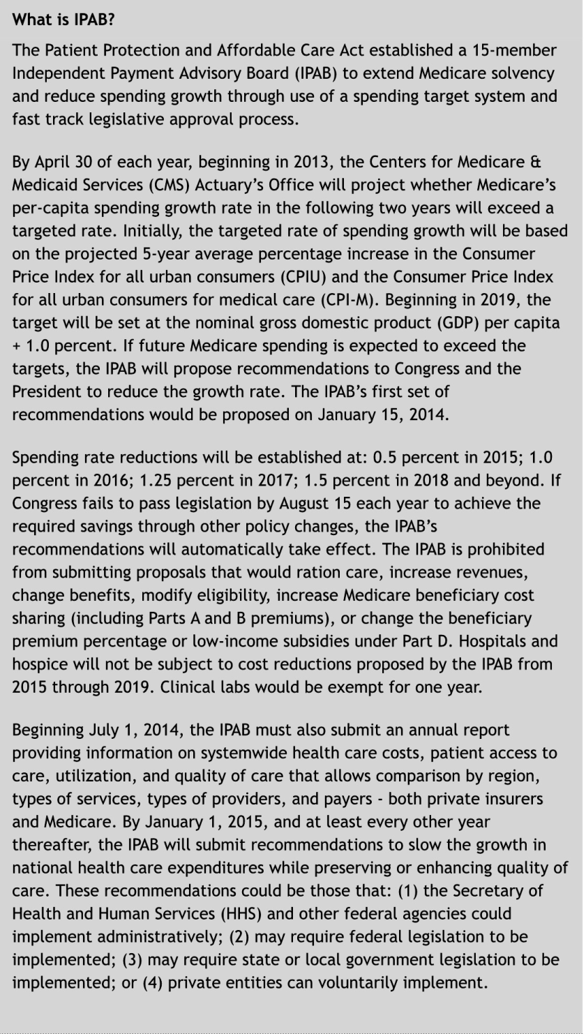 The Affordable Care Act created the Independent Payment Advisory Board (IPAB) frequently erroneously and unfairly labeled the death panel. The purpose was to make recommendations to Congress to control out-of-control health care costs, primarily Medicare.
