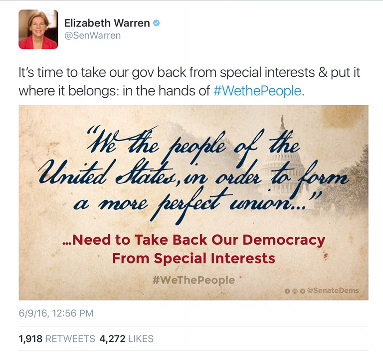 What old Liz really means of course is that we need to stop special interests that don’t agree with her ideology (or contribute to the Democratic Party).