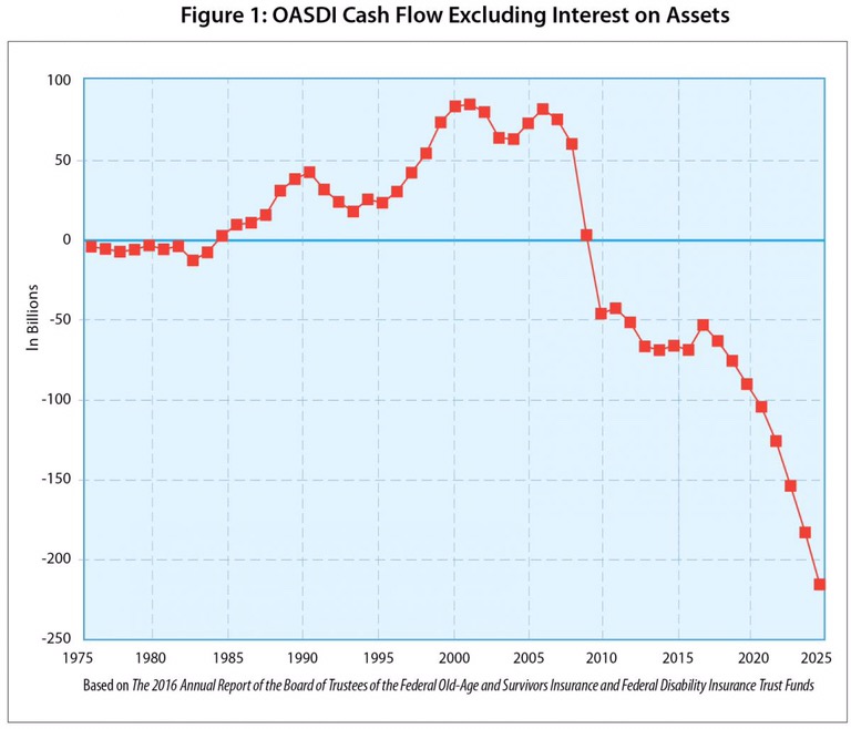 Figure 1 below shows the excess of income (excluding interest) over cost (referred to as a positive cash flow) in the period from 1976 through 2009, and the anticipated excess of cost over income through 2025. The excess of income over cost prior to 2009 has led to the current $2.8 trillion in trust fund asset reserves.