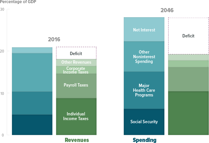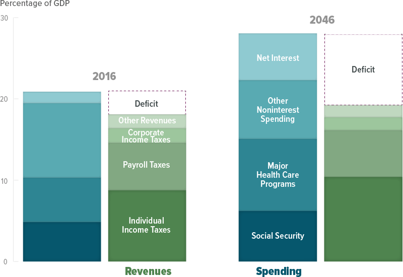 CBO’s long-run budget projections show a substantial imbalance in the federal budget beyond the next 10 years, with revenues falling short of spending by steadily increasing amounts. As a result, federal debt as a share of GDP would reach unprecedented levels if current laws generally remain unchanged. Such high and rising debt would have serious consequences for the nation’s budget and economy.