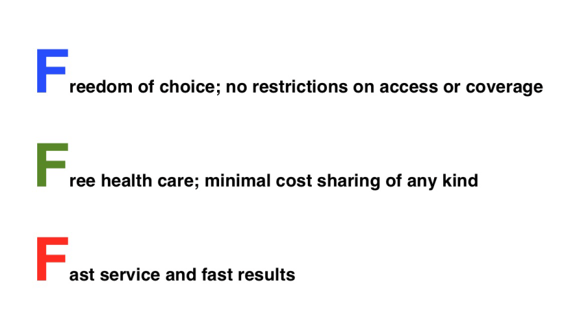 These are what I consider the three Fs of health care in America. If our experts can craft a system that meets the unrealistic expectations of Americans, more power to them.