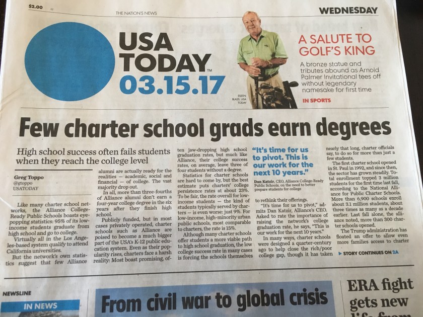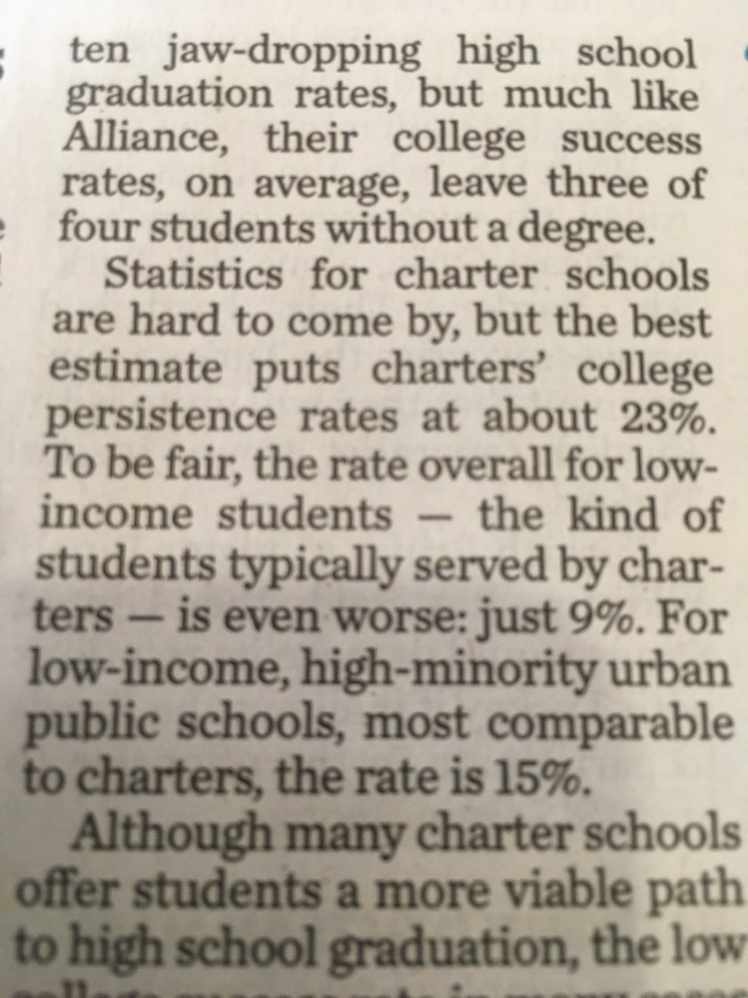 Another headline could have been. “Charter school grads earn degrees at higher rates than peers.”