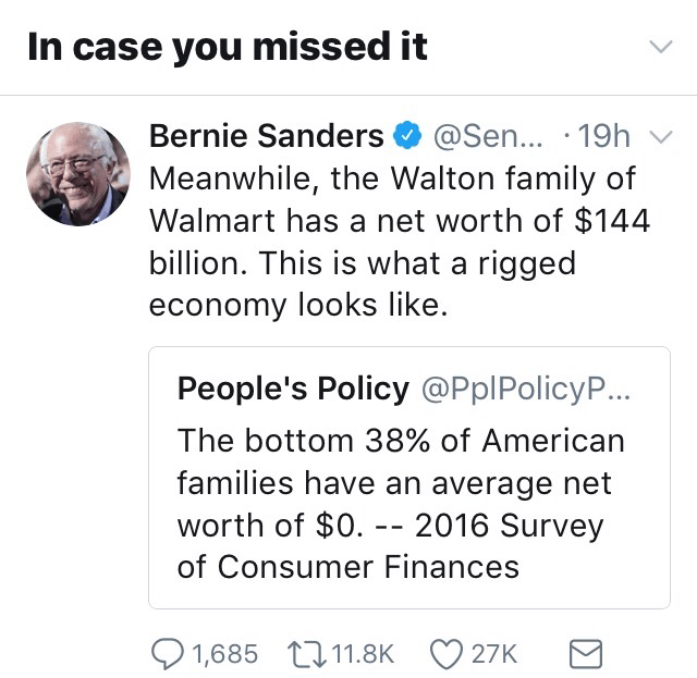 This is not a rigged system, it’s a working system. If the bottom 38% of Americans have zero net worth it’s their own damn fault. Sure there are some who are in true poverty with nothing much but the assistance they receive, but there are many more who have no net worth because they are imprudent spenders, savers and borrowers. Nothing is rigged except their own priorities and life choices. Sanders blabber gives these folks another excuse to complain and point fingers at someone else as the cause of their state in life.