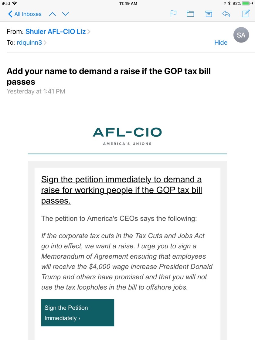 The $4,000 referenced below is pie in the shy political rhetoric from the White House, we all know that, except perhaps many average workers and people receiving the below e-mail. But that’s not the point. The point is, what appears simple is far from it. What appears a windfall may or may not be and may be lasting or fleeting. To ignore all that and simply say, “we want more” is what got the auto industry and others in trouble (including currently many states).
