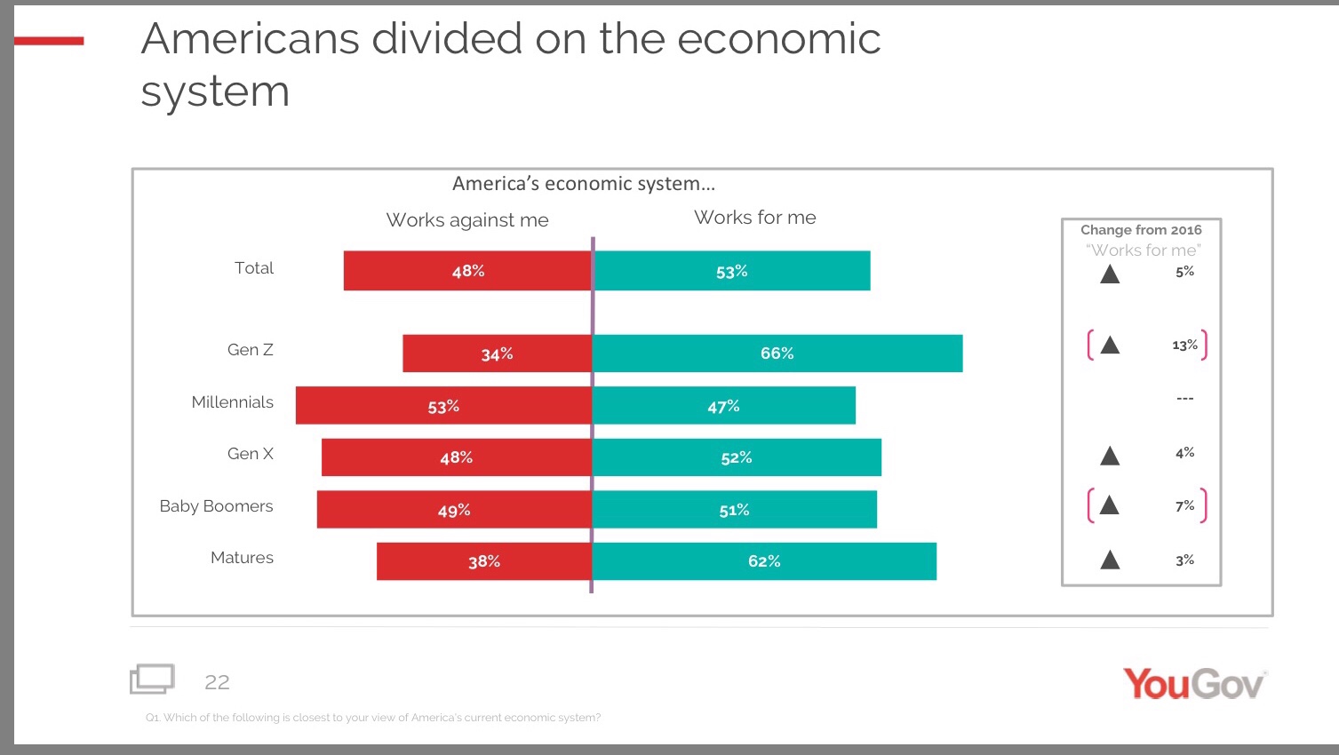 A recent survey from YouGov indicates that many millennials are turned off on capitalism and would rather live under a socialist system. Their gripe is fairness, opportunity and that they have little chance of doing as well as their parents. As the graph below shows many think our system works against them.