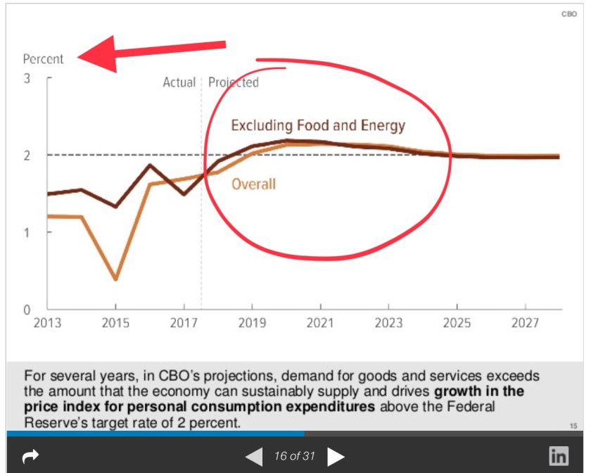 In any case, as you can see below the Congressional Budget Office predicts rather low inflation for many years in the future. If you are retired or about to be, planning your budget, expenses or income growth should not include overly optimistic growth assumptions. It’s better to be surprised and happy than disappointed and in financial trouble.