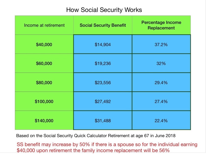 The less you earn, the greater percentage of your pre-retirement income will be replaced by Social Security. It’s designed that way; to provide a higher proportional benefit to lower income Americans. You can see that in action below. Of course, the closer your earnings are to the taxable wage cap, the higher dollar amount the benefit, but the lower the replacement percentage and the more saving and investing is the individuals responsibility.