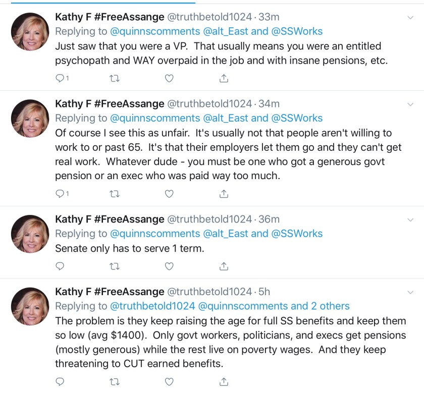 This women looked up my profile and is talking about me. The Tweets started when she criticized the fact members of congress can receive a pension. It then moved to Social Security.