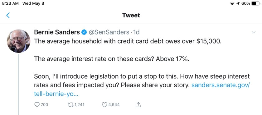 By the way, the average credit card balance from month to month is less than half the amount Sen Sander’s quotes.