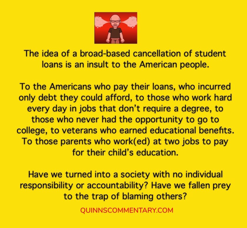 What an injustice to those who have already paid off their student loan debt…or those who worked hard not to get into student loan debt… or those whose parents saved for decades and have already paid their college tuition.