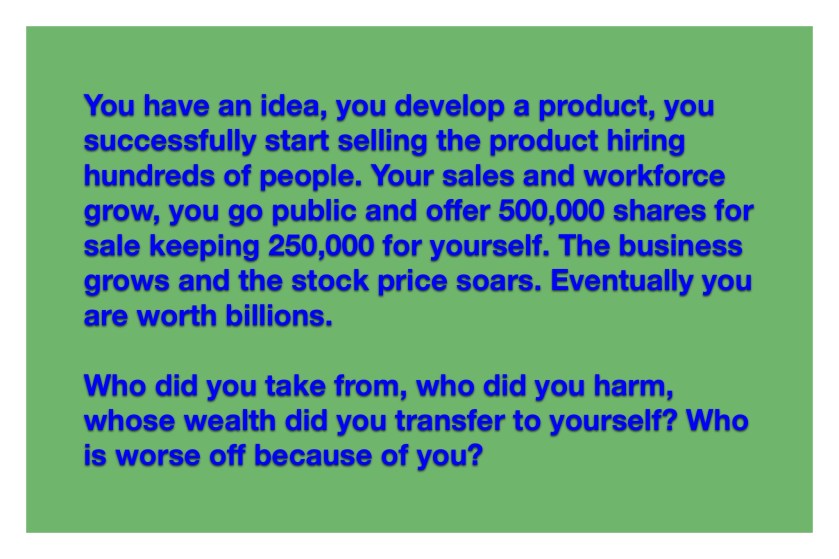 Before accepting the second assumption that wealth inequality somehow transfers money from the middle class to the wealthy, we need one question asked; how? Wealth is not part of a finite pie, it expands. Who did Gates, Zuckerberg, Musk or Bezos take wealth from…and how? Each of these individuals created their wealth via the process I describe above. Others create their wealth through investing, including in the companies represented by these individuals.