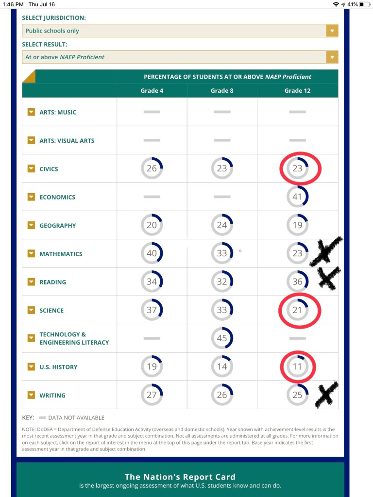 The NAEP report card screen shot is very interesting, although it is slightly different then the one I just googled. I was shocked by “economics” being at 41 (42 on the one I found at https://www.nationsreportcard.gov/) and US history is at 12. With what is going on in the US and the total lack of historical perspective make sense for the history grade. But people do not have basic economic or financial common sense in reality (housing crisis as proof or the current covid-19 crisis) and they can’t do math by this report card so how is the economics grade the highest? Turns out on that the source data is from 2012. In fact most of the data is greater than 5 years old. Yes it is a snapshot in time, but is it really true that most high school students retained only about 1/3 of what they were taught? Maybe they should only get 1/3 of the starting pay. Forget about college, they are set up to fail. Don’t waste public money on a loss cause. I think we need to fix high schools first before free college. Employees need a basic level of skills.