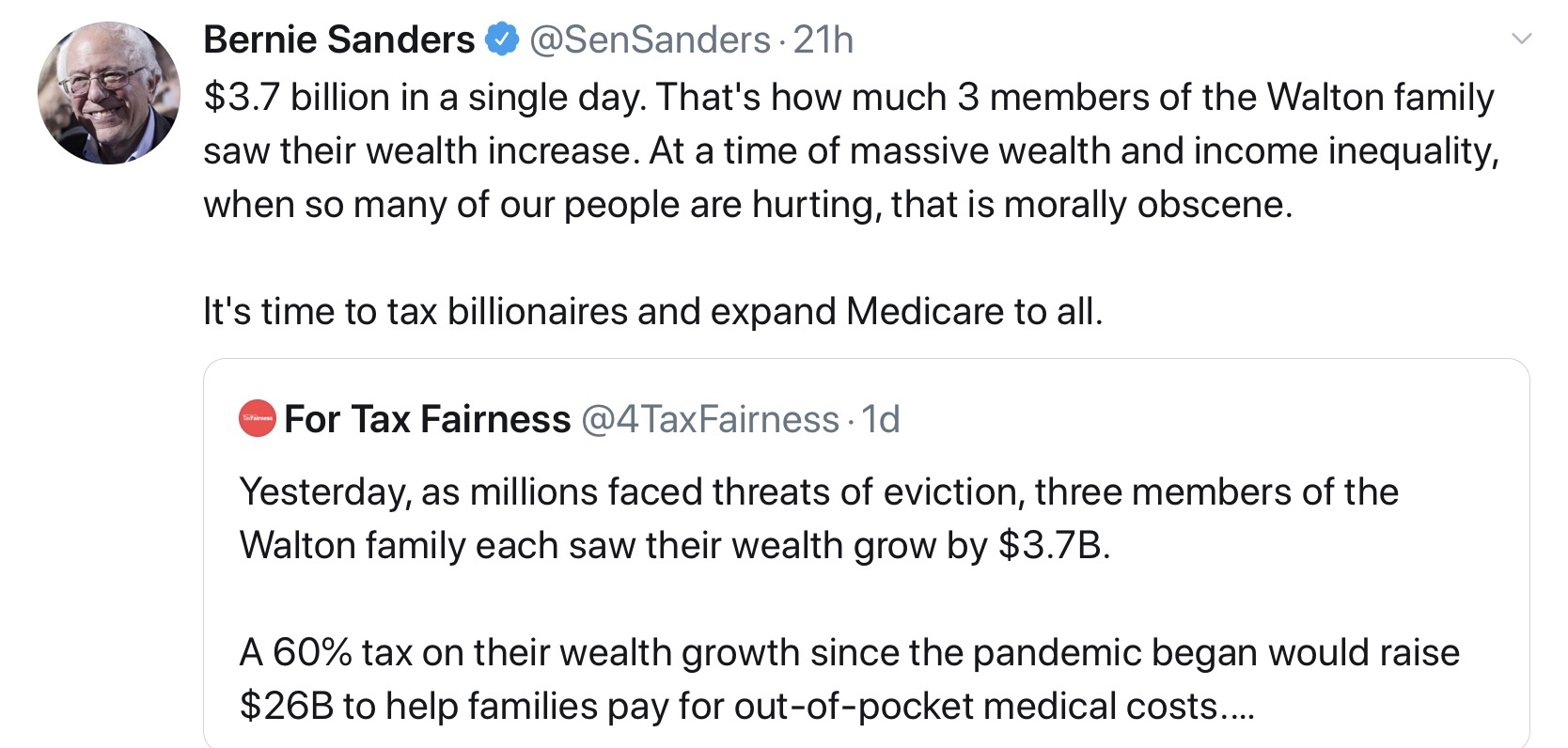 Bernie Sanders like all progressives are idiots. If you raise Walmart”s taxes or the Walton’s family taxes, they will just raise the price of the goods that they sell to make up the loss of paying the higher taxes. So Walmart customers will pay for the tax increase. and be in worse shape, than if they just paid their out of pocket medical costs. I spend way more each year at Walmart than I do in out of pocket medical costs.